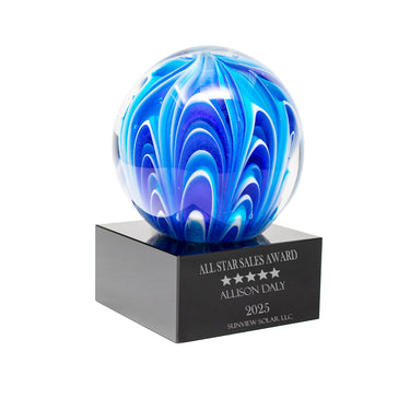 Celebrate exceptional achievement with the stunning 5" Blue & White Sphere Art Glass Award.