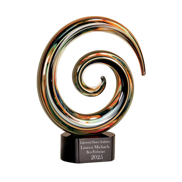 The black glass base offers a refined contrast that beautifully highlights the vivid colors of the swirl, while providing ample space for custom engraving. Whether you're honoring leadership, commemorating a major milestone, or celebrating a significant accomplishment, your personalized message will be showcased with frosted precision. The dynamic interplay of color and form reflects creativity and excellence, making this award a meaningful tribute to success.